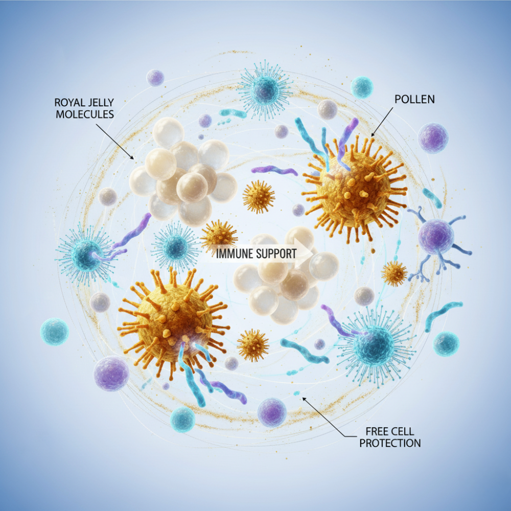Made with Royal Jelly, Pollen, and Propolis, it naturally replenishes your energy, strengthens your immunity, and helps your body adapt to stress — the way nature intended.